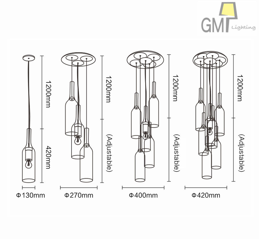 Model: Pendant Lamp Item No.: P-002K Size: Φ130*420mm Suspension Cable: 1200mm Φ270*420mm(Adjustable) Suspension Cable: 1200mm Φ400*420mm(Adjustable) Suspension Cable: 1200mm Φ420*420mm(Adjustable) Suspension Cable: 1200mm Material: Glass + Metals Lighting Source: E27 1*60W Color: White, Violet, Blue, Yellow-Green